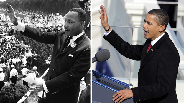 Martin Luther King Jr. waves to supporters during the 1963 March on Washington and President Barack Obama speaks at his first inauguration in 2009.